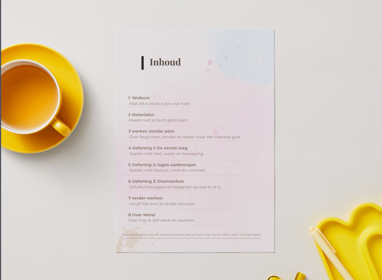 Dit e-book heb ik gemaakt als uitnodiging om toch te starten. Om te merken dat je niet eerst een plan nodig hebt. Dat de eerste penseelstreek genoeg is.