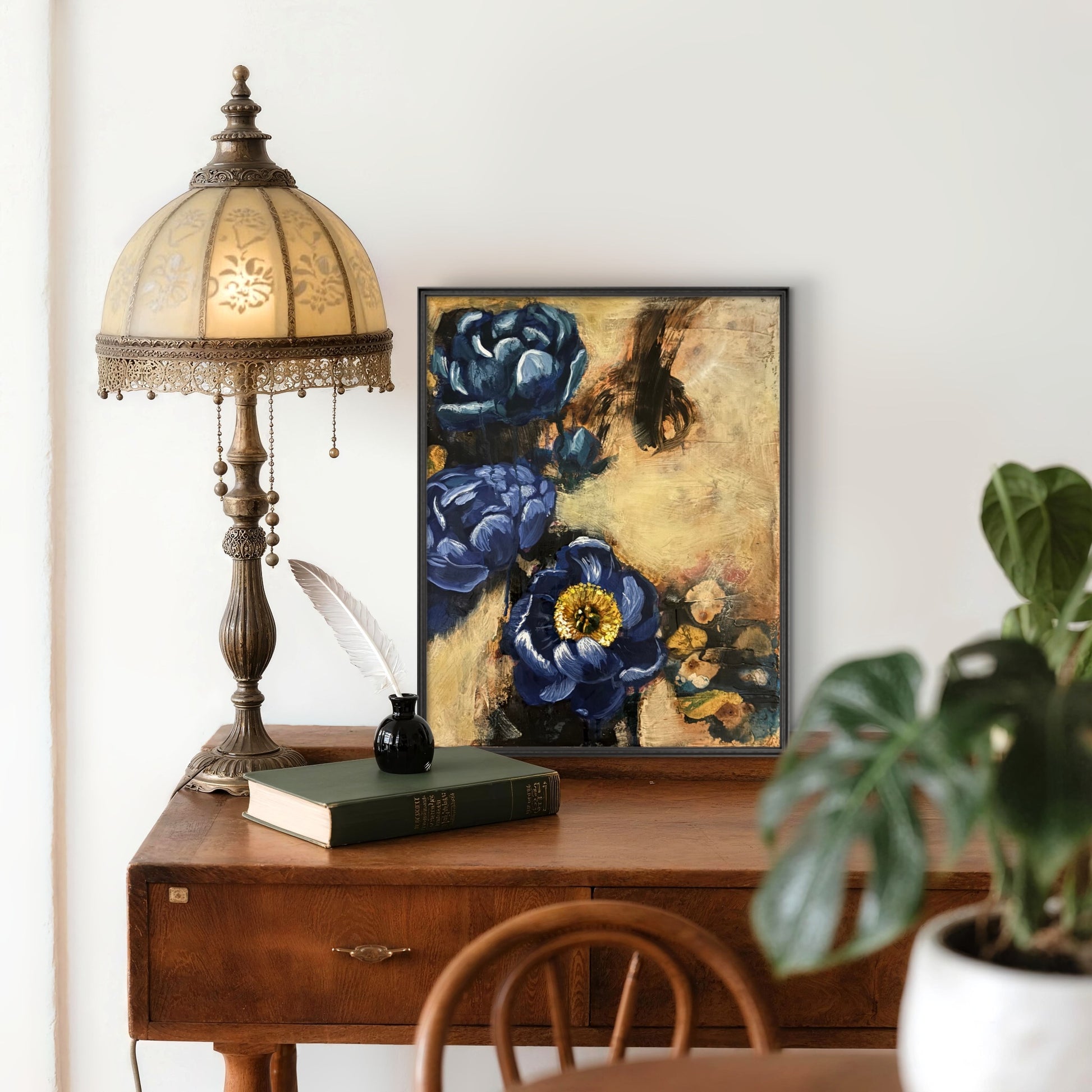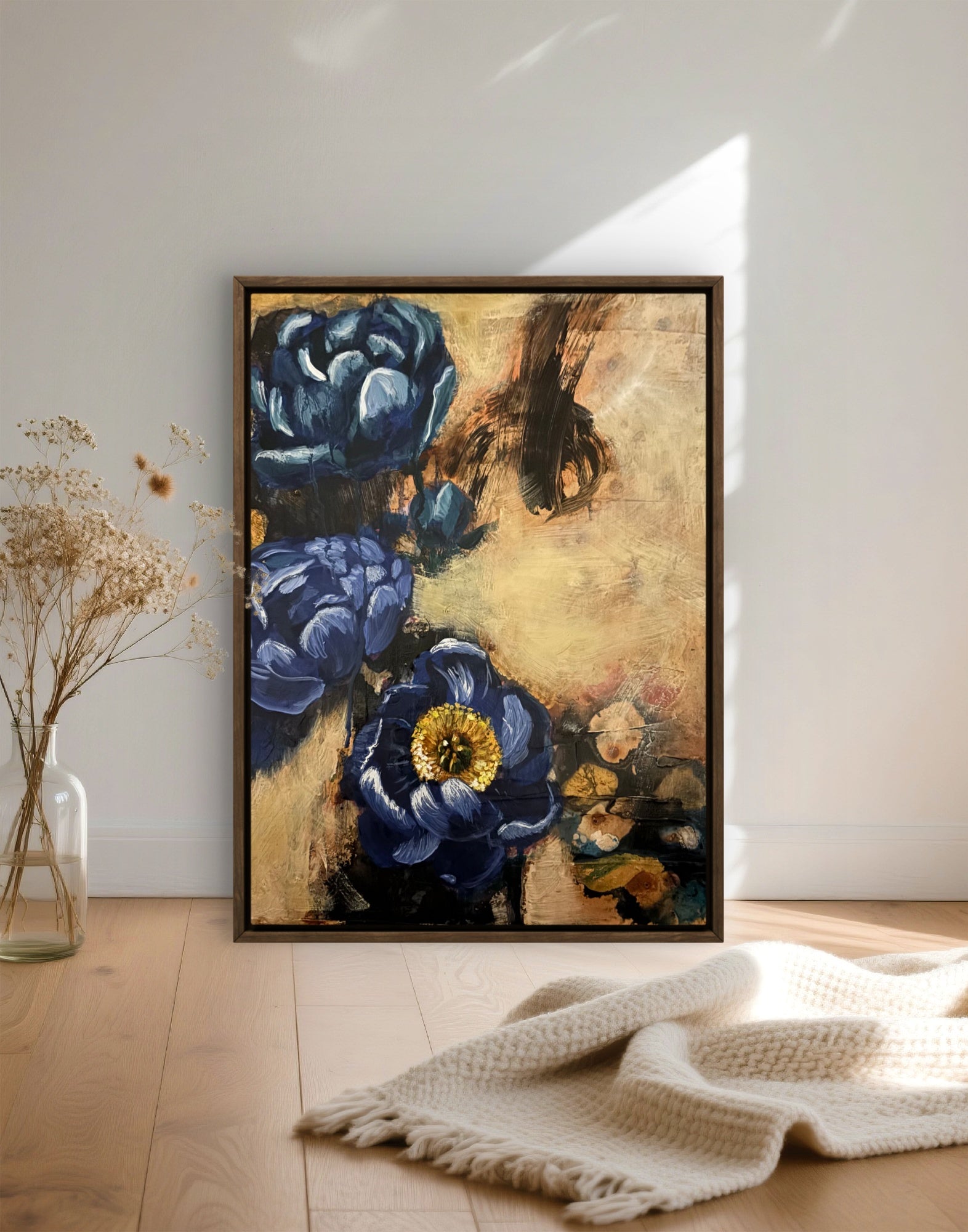 Het werk begon speels, met losse lagen inkt. Zonder vast plan, meer als zoeken dan als sturen. Vanuit die onderlaag ontstonden de bloemen in acryl. In de laatste fase zijn ze afgewerkt met olieverf, om diepte en levendigheid toe te voegen en het werk te laten “landen”.